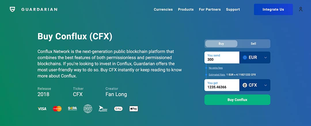 When it comes to buying CFX, there are numerous options available online. However, if you’re looking for the best rates and a swift checkout process, we highly recommend exploring Guardarian. With Guardarian, you have the convenience of purchasing and selling over 400 cryptocurrencies securely and without the need for registration. Experience a seamless and efficient platform for all your cryptocurrency transactions.