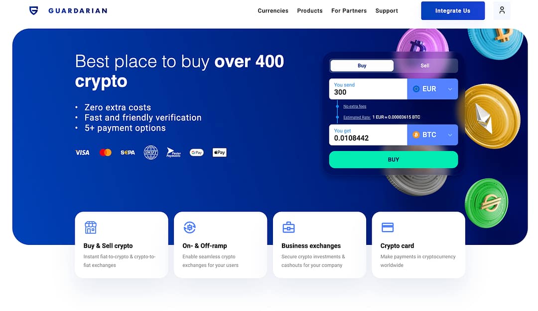 Guardarian has the widest range of supported currencies, with over 400 cryptocurrencies and over 40 fiat currencies available. We also support all major payment methods, including the new but popular Revolut Pay.